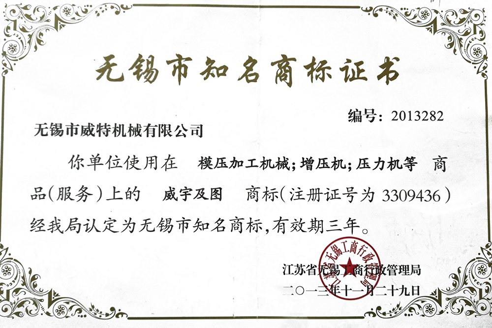 無錫市知名商標證書